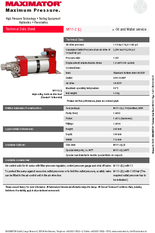 MAXIMATOR pumps M series are available as single or double acting with either a single, double or triple air drive head. For air drive pressures from 1 bar (14.5 psi) minimum to 10 bar (145 psi) maximum.