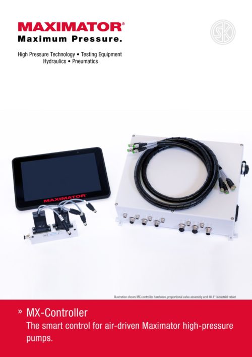 The MX controller consists of a pneumatic control unit to control the drive pressure of an air-driven pump or a pump system. The controlis carried out by a microcontroller specially developed for air-driven Maximator high-pressure pumps. The embedded PC enables the operator to manage recipes and log test results with a user-friendly and intuitive user interface.