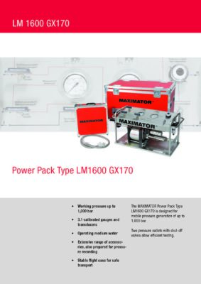 The MAXIMATOR Power Pack Type LM1600 GX170 is designed for mobile pressure generation of up to 1,000 bar. Two pressure outlets with shut-off valves allow efficient testing.
