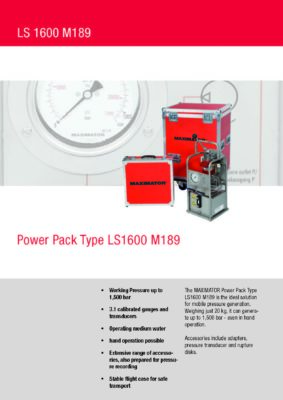 The MAXIMATOR Power Pack Type LS1600 M189 is the ideal solution for mobile pressure generation. Weighing just 20 kg, it can generate up to 1,500 bar – even in hand operation. Accessories include adapters, pressure transducer and rupture disks.